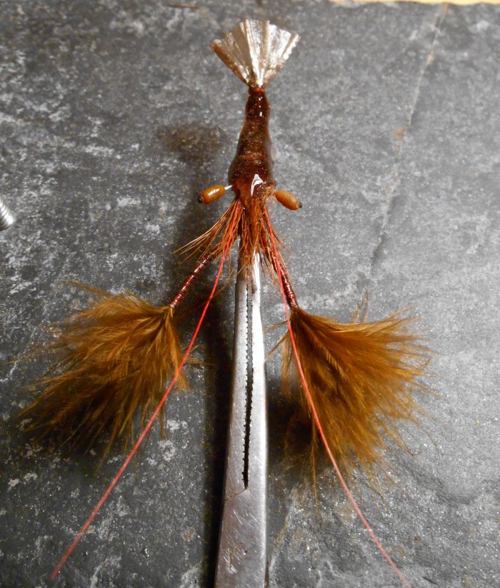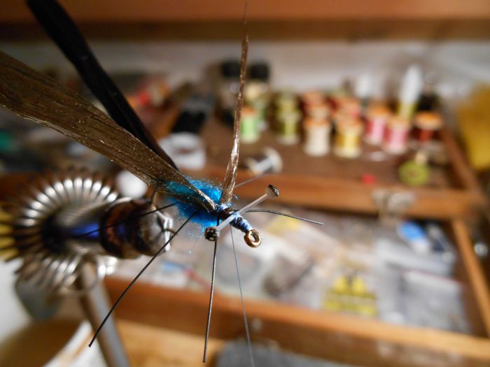 Matériaux: Hameçon n°6 ou 8 hampe courte (de préférence assez fin de fer), fil de montage bleu, queue de libellule en nylon tressé, dubbing Antron bleu, raphia synthétique noir pour le corps & marron pour les ailes, fluoro de 45/100 pour les yeux, poils de balai fins pour les pattes, cyano, vernis.